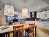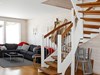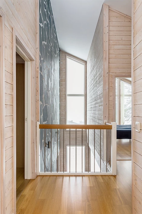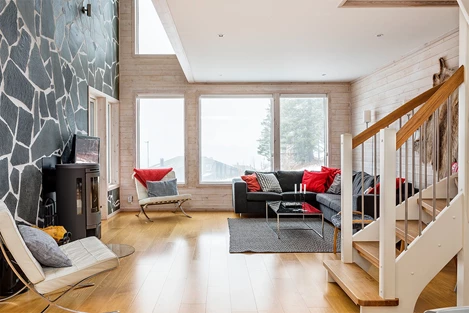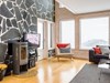 Den här lägenheten håller hög standard vad gäller inredning och materialval. Väggarna är ljusa och i vitalaserat trä. I allrummet finns en mäktig vägg med skiffer. Alla golv är av ekparkett förutom hall och badrum.