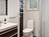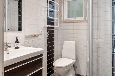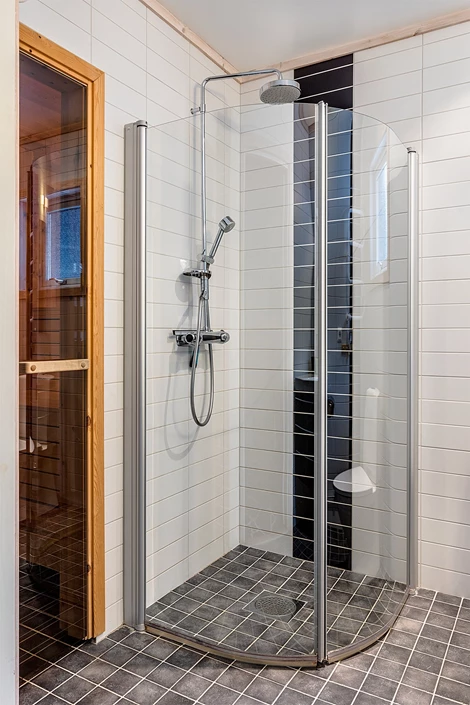 Duschrum bv: Klinkergolv och kaklade väggar. Duschhörna med infällbara dörrar, handfat med kommod, WC, väggspegel samt elektrisk handdukstork. Innanför duschrummet finns en bastu.
