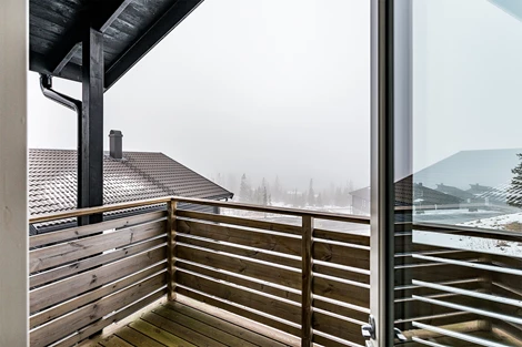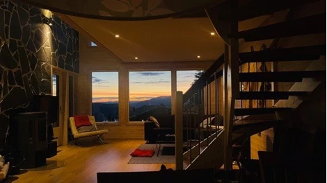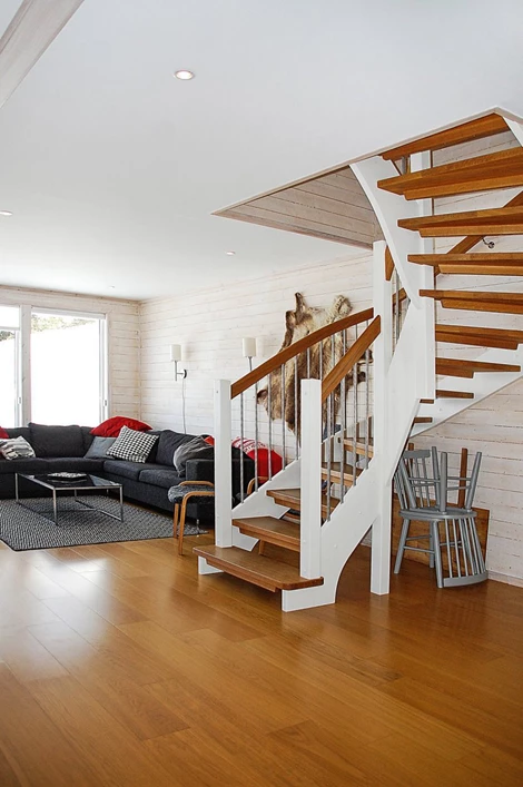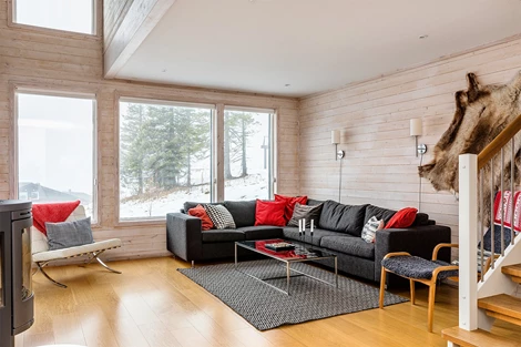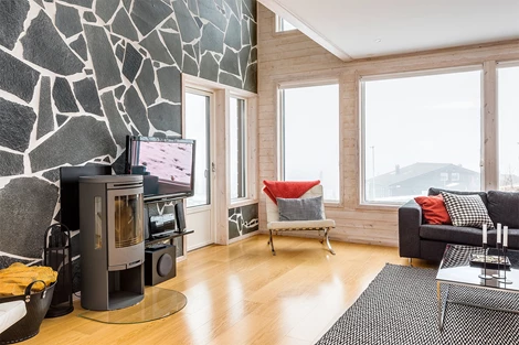 Allrum: Högt till tak, hela 6 meter till nocken. En vacker skiffervägg ger atmosfär i rummet tillsammans med braskaminen. Det finns en utgång till altanen varifrån du kan njuta av härliga vyer över Åreskutan och de omkringliggande fjällen. Altanen har sydostläge. Från allrummet leder trappen upp till ovanvåningen.