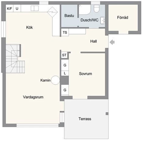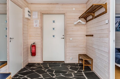 Hall: Vid entrén ligger ett gediget skiffergolv. I hallen finns hatthylla för ytterkläder, städskåp samt ett torkskåp.