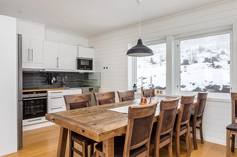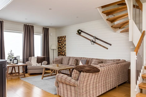 Gedigen inredning med tolv sängar totalt. Soffgrupp och rejält matbord med ett dussin stolar finns i det härliga allrummet som har panoramafönster och utgång till altan som vetter mot Åreskutan. Skiffergolv vid entrén och övriga golv är ekparkett. Badrummen har kaklade väggar och klinkers på golvet. Golvvärme på båda våningarna.