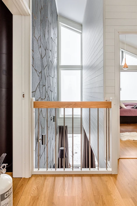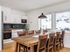 Allrum/kök: Öppen planlösning med kök och umgängesytor i samma rum. Öppet upp till nocken med hela 6 meter i takhöjd. Kaminen står mot en skifferklädd vägg. Övriga väggar är vita. Utgång till altan.