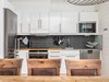 Köket har vita luckor, arbetsbänk i trä med stavmosaik ovan. Maskinell utrustning: Kyl/frys, ugn, spishäll, köksfläkt, mikrovågsugn samt diskmaskin.
