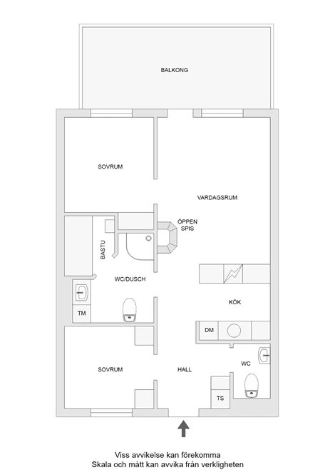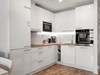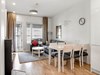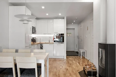 Allrum och kök i öppen planlösning. Kök med mikrovågsugn, diskmaskin, spis och fläkt. Kyl/frys.