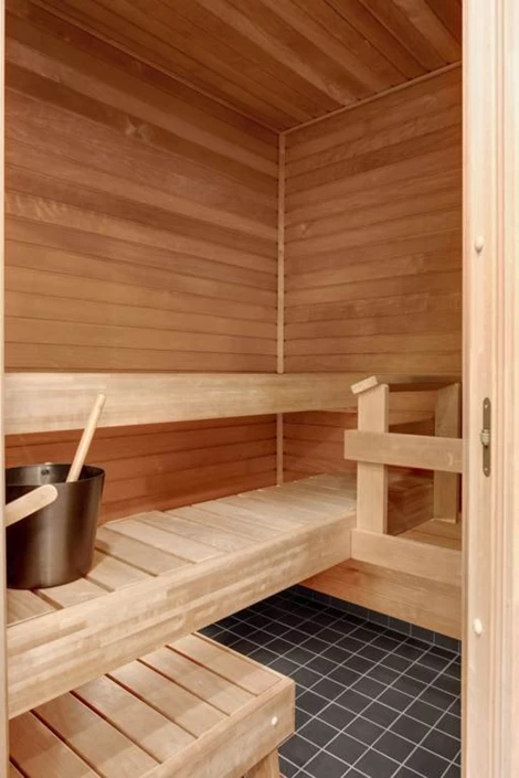 Duschrum med wc, bastu och tvättmaskin samt torkskåp.