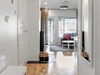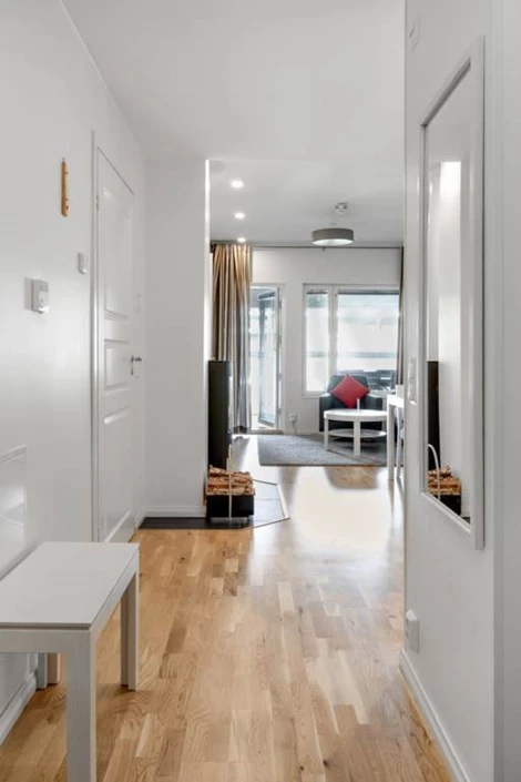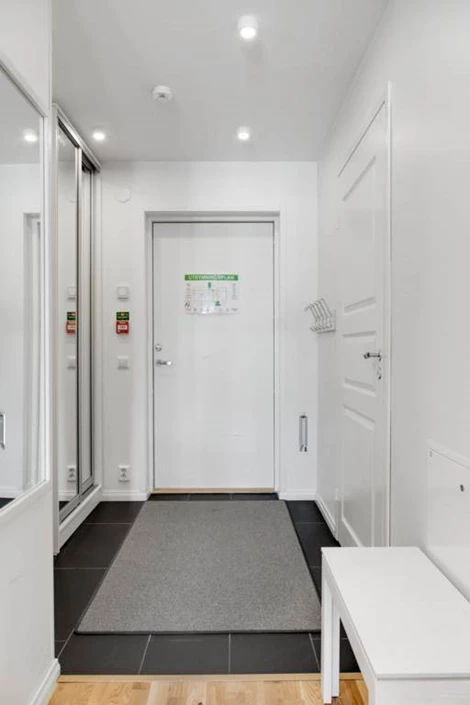 Entré med avhängningsmöjligheter för ytterkläder. En garderob och ett städskåp finns i hallen.