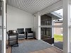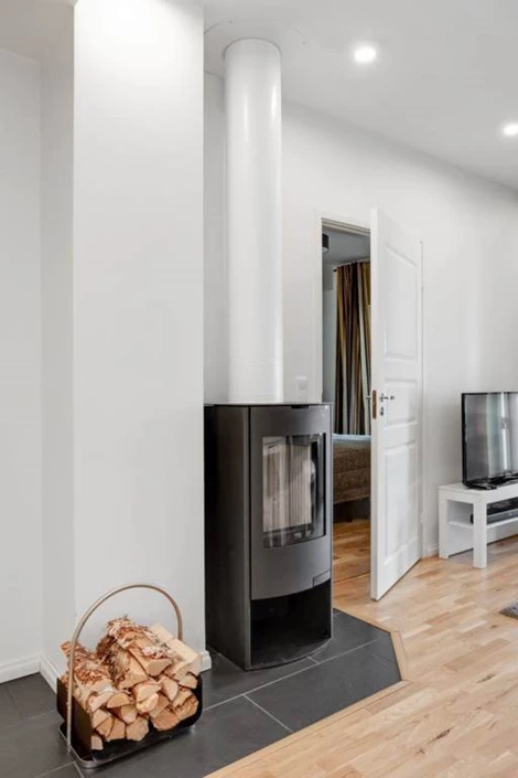 Allrummet är möblerat med bäddsoffa som har plats för två personer, fåtöljer och soffbord samt matbord och stolar. Kamin finns.