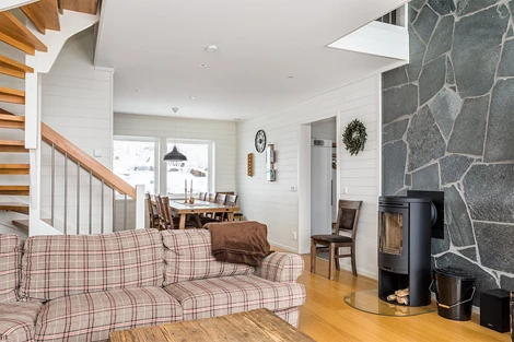 Allrum/kök: Öppen planlösning med kök och umgängesytor i samma rum. Väggar med vit slät panel och öppet upp till nock med hela 6 meter i takhöjd. Kaminen står mot en skifferklädd vägg. Övriga väggar är vita. Utgång till altan.