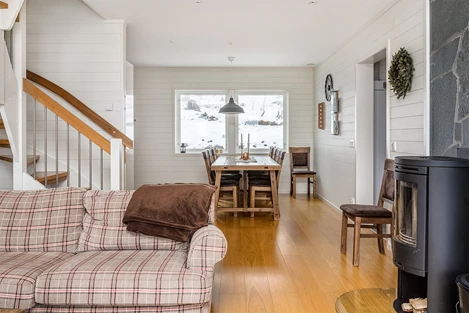 Gedigen inredning med tolv sängar totalt. Soffgrupp och rejält matbord med ett dussin stolar finns i det härliga allrummet som har panoramafönster och utgång till altan som vetter mot Åreskutan. Klinkergolv vid entrén och övriga golv är ekparkett. Badrummen har kaklade väggar och klinkers på golvet. Golvvärme på båda våningarna.