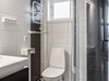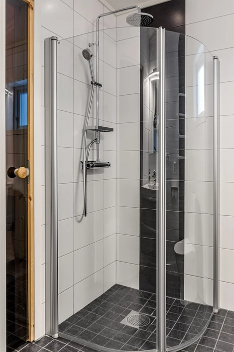 Badrum: Duschhörna, handfat med kommod samt WC. Bastu.