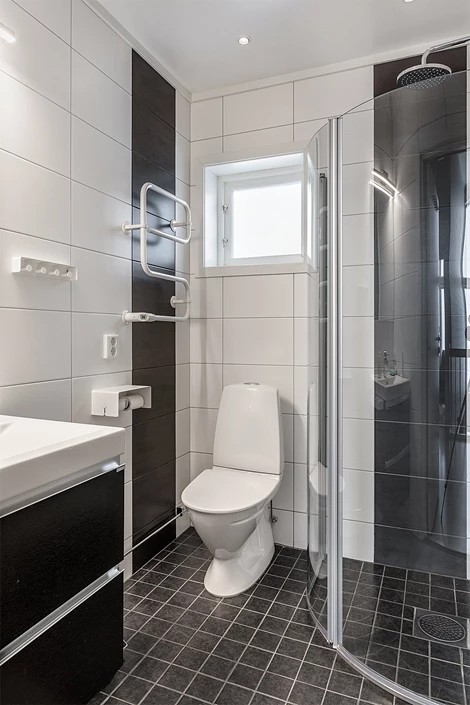 Badrum: Handfat med kommod, WC samt duschhörna. Handdukstork.