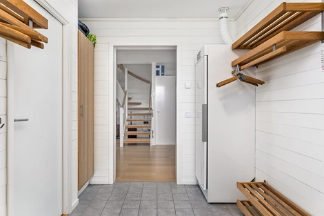 Hall: Praktisk hall med hatthylla och torkskåp.