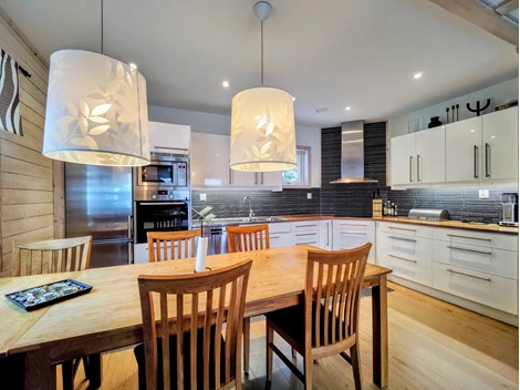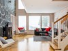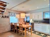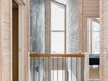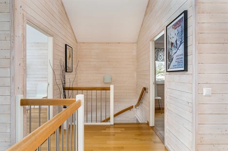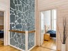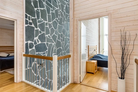 Den här lägenheten håller hög standard vad gäller inredning och materialval. Väggarna är ljusa och i vitalaserat trä. I allrummet finns en mäktig vägg med skiffer. Alla golv är av ekparkett förutom hall och badrum.