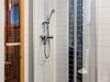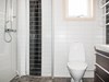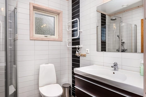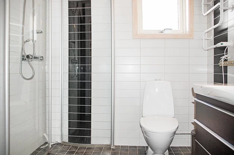 Duschrum bv: Klinkergolv och kaklade väggar. Duschhörna med infällbara dörrar, handfat med kommod, WC, väggspegel samt elektrisk handdukstork. Innanför duschrummet finns en bastu.