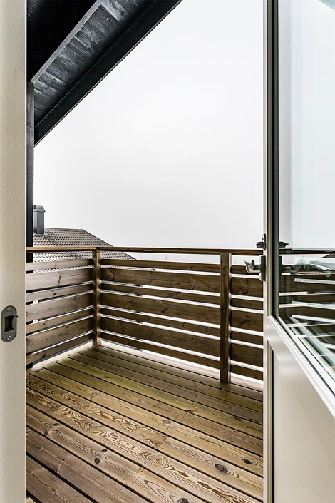 Allrum: Högt till tak, hela 6 meter till nocken. En vacker skiffervägg ger atmosfär i rummet tillsammans med braskaminen. Det finns en utgång till altanen varifrån du kan njuta av härliga vyer över Åreskutan och de omkringliggande fjällen. Altanen har sydostläge. Från allrummet leder trappen upp till ovanvåningen.