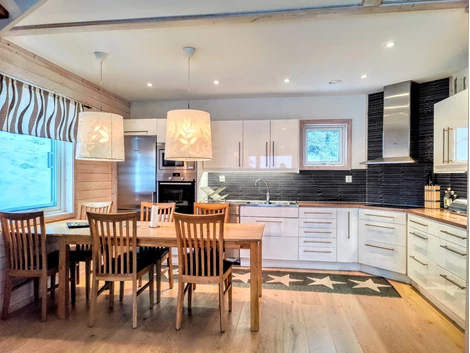Kök: Den öppna planlösningen från kök ut mot allrummet skapar ytterligare rymd. Köksluckorna är släta vita, arbetsbänk i ek med stavmosaik ovan. Maskinell utrustning: Ugn, induktionshäll, köksfläkt, kyl/frys samt mikrovågsugn och diskmaskin.
