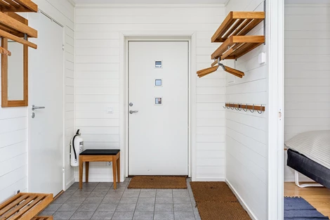 Hall: Praktisk hall med hatthylla och torkskåp.