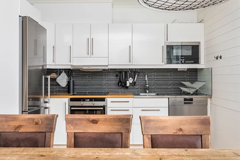 Köket har vita luckor, arbetsbänk i trä med stavmosaik ovan. Maskinell utrustning: Kyl/frys, ugn, spishäll, köksfläkt, mikrovågsugn samt diskmaskin.