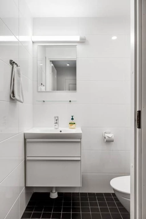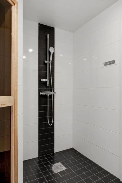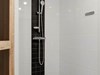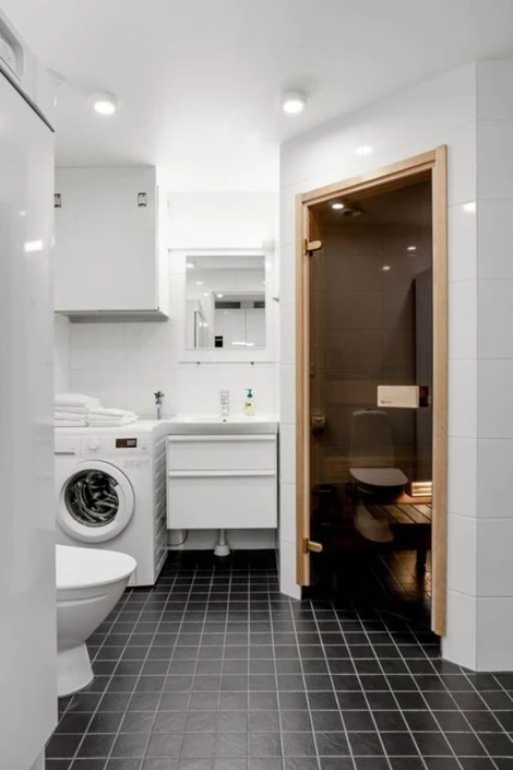 Duschrum med wc, bastu och tvättmaskin samt torkskåp.