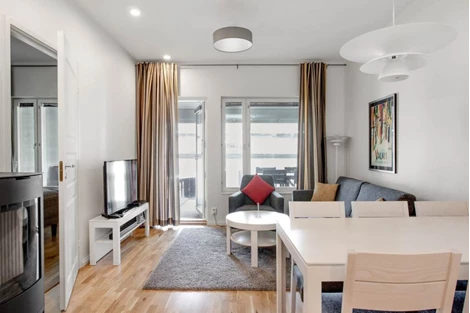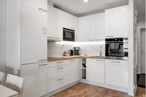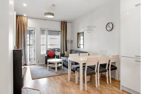 Allrum och kök i öppen planlösning. Kök med mikrovågsugn, diskmaskin, spis och fläkt. Kyl/frys.