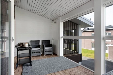 Allrummet är möblerat med bäddsoffa som har plats för två personer, fåtöljer och soffbord samt matbord och stolar. Kamin finns.