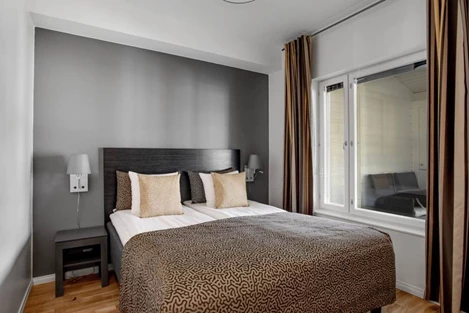 Andel vecka 47 i välplanerad lägenhet med två separata sovrum. Det finns två bäddar i varje sovrum.