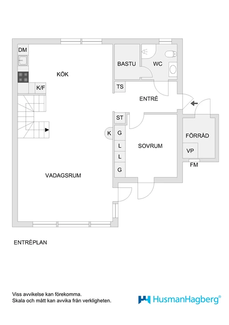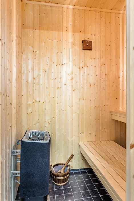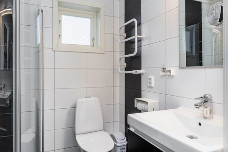 Badrum: Duschhörna, handfat med kommod samt WC. Bastu.